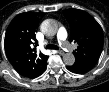 圖:胸部增強CT(CTPA)示右肺動脈主干及分支內可見多發充盈缺損提示肺動脈栓塞
