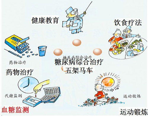 五駕馬車說的是糖尿病的治療:第1駕馬車是 飲食治療:是每個糖尿病病人治療的基礎。第2駕馬車是運動:輔助飲食治療,降低血糖,提高整體健康水平。第3駕馬車是降糖藥物:在飲食治療的基礎上,改善體內糖代謝過程,力爭達到接近正常人的血糖水平,既保證人體能量所需,又利于達到各項控制指標。第4和第5駕馬車是糖尿病教育和病人自我監測血糖:是以上治療措施能否正確實施的保障。監測血糖如同高血壓病人監測血壓一樣重要,是判斷治療效果和調整治療方案最直接的證據。
