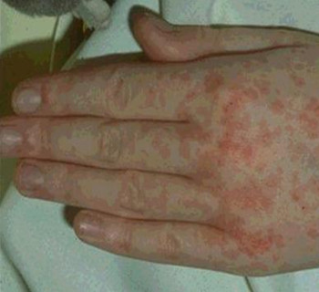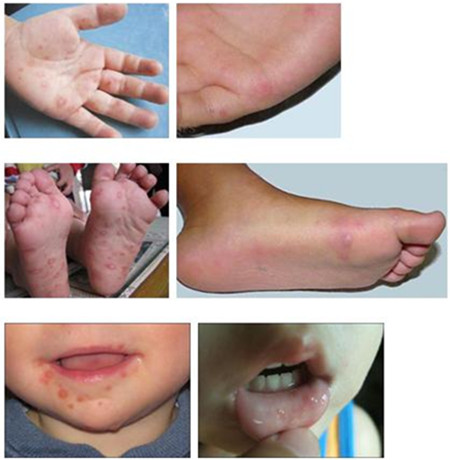 主要癥狀:先出現發燒癥狀,手心、腳心出現斑丘疹和皰疹(疹子周圍可發紅),口腔粘膜出現皰疹和/或潰瘍,疼痛明顯。部分患者可伴有咳嗽、流涕、食欲不振、惡心、嘔吐和頭疼等癥狀。少數患者病情較重,可并發腦炎、腦膜炎、心肌炎、肺炎等。