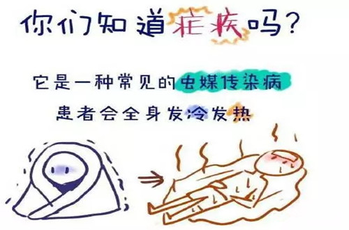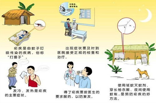 瘧疾,俗稱"打擺子"、"瘴氣"、"冷熱病",此病為夏秋之季最常見的危害人體健康的寄生蟲病。引起瘧疾的病原體是瘧原蟲,瘧原蟲是一種很小的寄生蟲,由蚊子傳播,當(dāng)蚊子咬人吸血時(shí),把瘧原蟲帶入人體血液,引起傳播流行。寄生于人體的有四種,即間日瘧原蟲、三日瘧原蟲、惡性瘧原蟲、卵形瘧原蟲。在我國(guó),間日瘧原蟲較常見。