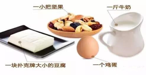 除了吃夠"十個網球",人們每天應該攝入"四個一"一個雞蛋、一斤牛奶、一小把堅果和一塊撲克牌大小的豆腐。