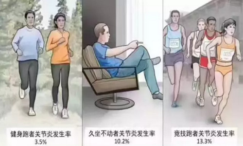 2017年美國《骨科與運動物理治療雜志》(JOSPT)發表論文(Meta分析)指出,競技跑步者的關節炎發生率為13.3%,久坐不動人群的關節炎發生率為10.2%,而健身跑步者的關節炎發生率僅為3.5%。因此大數據顯示長時間的大宗隨訪研究結果是:過量和高強度的跑步可能會引發關節問題,但對于普通健身跑步的人來說,跑步是有利于關節健康的。