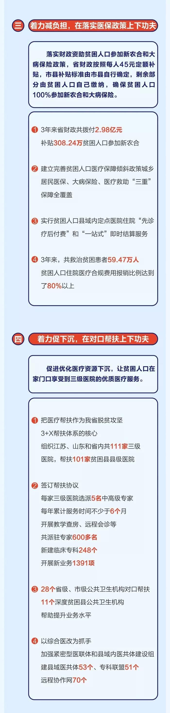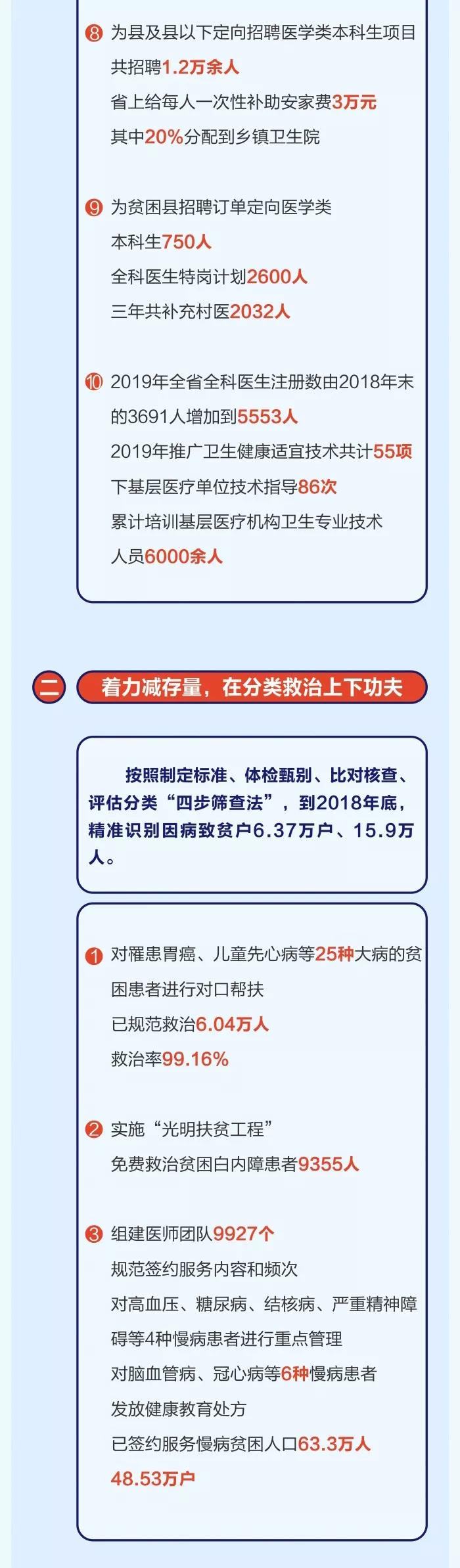 2017年以來,全省各級衛生健康部門認真學習領會習近平總書記關于扶貧工作的重要論述,堅決貫徹落實中央和省委、省政府脫貧攻堅決策部署,把健康扶貧作為衛生健康工作的重大政治任務、重點民生工程和重要發展機遇,以基本醫療有保障為目標,堅持“兩手抓”工作思路(一手抓精準施治減存量、一手抓疾病預防控增量),盡銳出戰,攻堅克難,健康扶貧工作取得顯著成效,因病致貧戶較2016年減少13.83萬戶,為全省脫貧攻堅作出了重要貢獻。