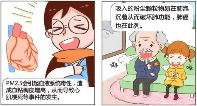 顆粒物主要由呼吸道進入機體,一般來說,粒徑越小,進入的部位越深,擴散的面積越大,停留時間越長,機體的吸收量就越大。顆粒物沉積在肺泡后,被肺泡吸收,經(jīng)血液送到全身,不經(jīng)肝臟的轉(zhuǎn)化即對全身起作用,因此經(jīng)呼吸道進入體內(nèi)引起許多危害,容易導(dǎo)致急性中毒、心血管疾病、肺心病等,顆粒物還可引起機體免疫功能下降,導(dǎo)致癌癥的發(fā)生和死亡。