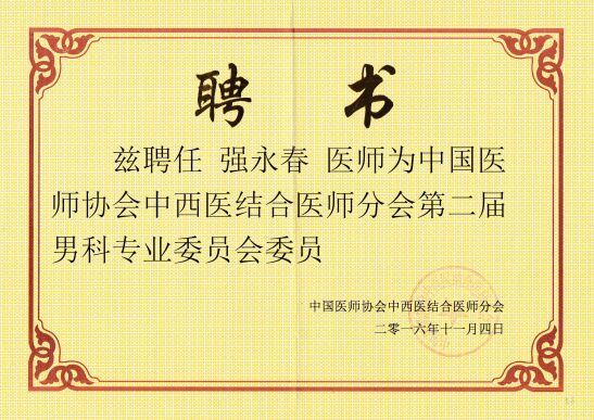 近日,從中國醫(yī)師協(xié)會中西醫(yī)結(jié)合醫(yī)師分會獲悉,我院泌尿外科強永春主任被聘為中國醫(yī)師協(xié)會中西醫(yī)結(jié)合醫(yī)師分會第二屆男科專業(yè)委員會委員。