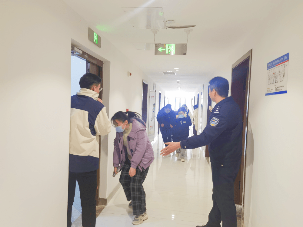 消防講座結束后,從發現火情、求救求助、疏散逃生等全過程進行了演練,一陣急促的警報聲拉開了“宿舍消防安全疏散演練”活動的帷幕,聽到警報聲,全員立即到達指定崗位,郭俊鵬科長、寇森隊長指導學生快速疏散,聽到指令后學生彎著腰、貓著步,捂住口鼻,沿著樓道快速前進,有序撤離到安全地帶,隨即清點人數,層層向上匯報。